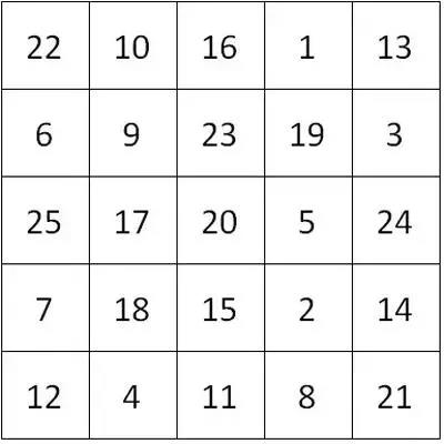 我国年轻的数学家杨乐、张广厚,小时候都曾采用快速做习题的办法,严格训练自己集中注意力。这里给大家介绍一种在心理学中用来锻炼注意力的小游戏。在一张有25个小方格的表中,将1-25的数字打乱顺序,填写在里面(见下表),然后以最快的速度从1数到25,要边读边指出,同时计时。